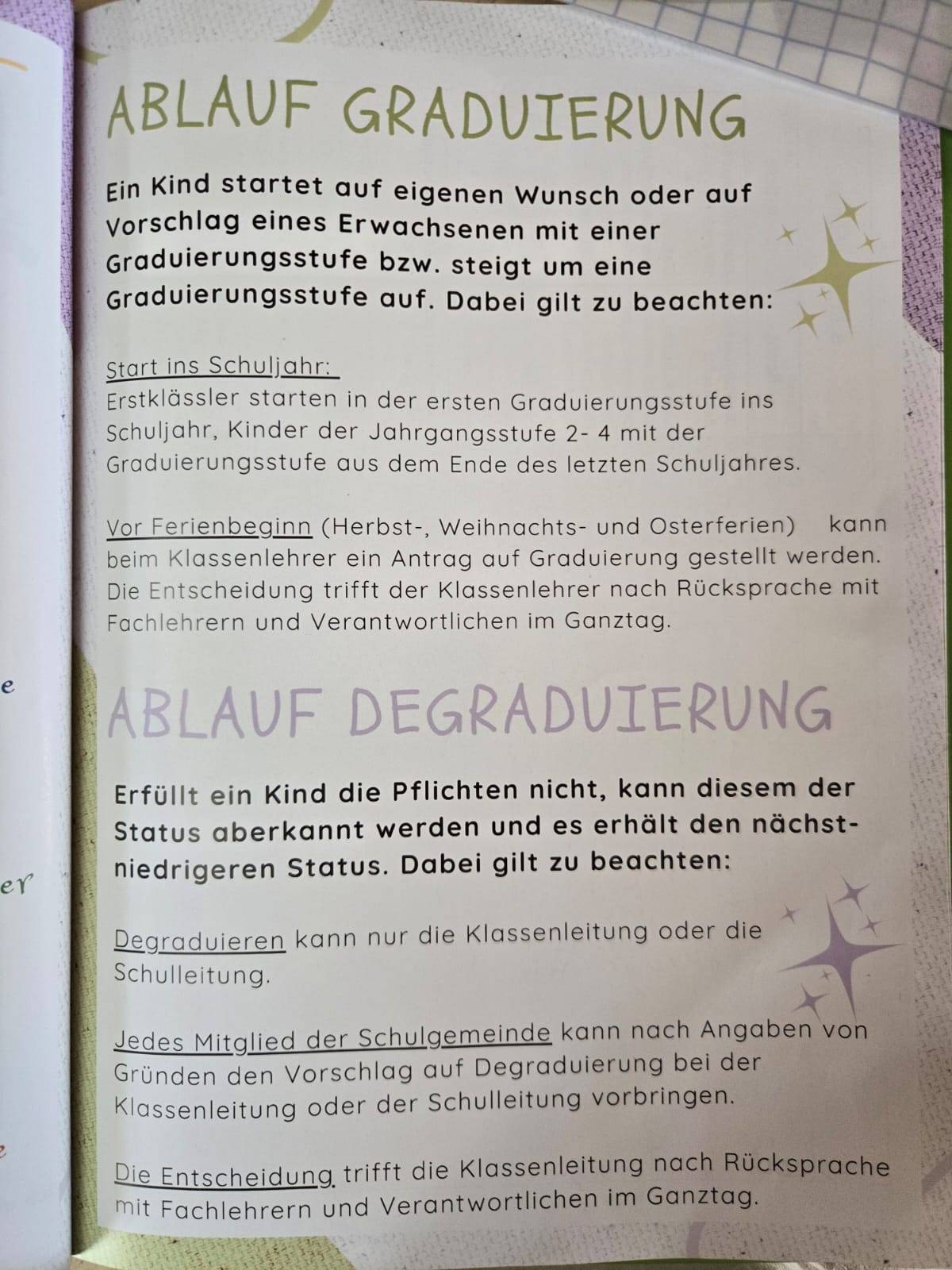 Eltern äußern Bedenken an der Wortwahl („Graduierung“, „Degradierung“), die sie als militärisch empfinden. Kritisiert wird außerdem, dass Grundrechte von Kindern in den Rang von Privilegien erhoben würden, die erst durch Wohlverhalten erworben werden müssten. Dies könne sozialen Druck erzeugen und extrinsische Anpassung fördern. Gerade in den Klassen 1–4 mit sechs- bis neunjährigen Kindern, so warnen Pädagogen, könnten Überforderung oder Demütigungserfahrungen die Folge sein. Auch der Vergleich zu einem „Sozialkreditsystem“ wurde von Kritikern gezogen.