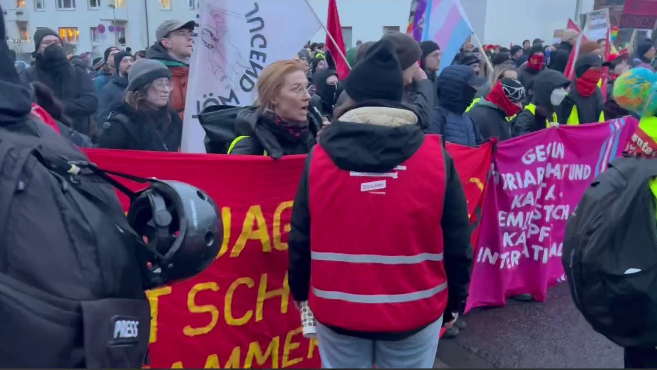 Offenbar war an diesem Tag — wie bei anderen solchen Anlässen — auch die Bundestagsabgeordnete Desiree Becker der Partei "Die Linke" vor Ort — als selbsternannte „parlamentarische Beobachterin“. Laut uns vorliegenden Informationen führte sie Gespräche mit Aktivisten, die ein Banner trugen, auf dem stand: