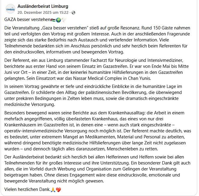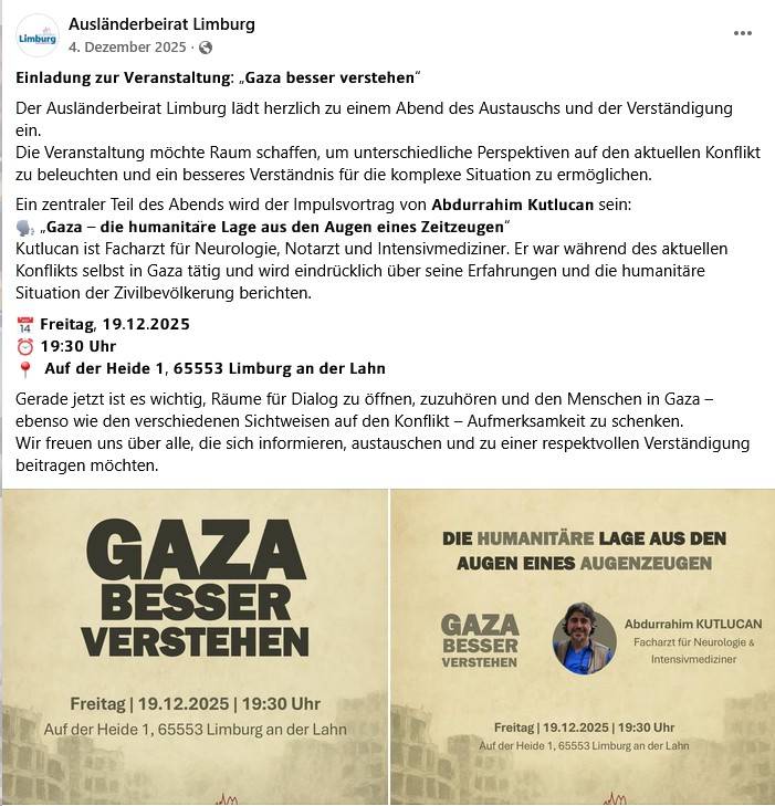 Es gibt aber auch einen weiteren klaren Hinweis auf die Moschee als Ort der Bildaufnahme. Und dieser wurde von Mustafa Yüce selbst am 20. Dezember 2025 auf Facebook geteilt. Er repostete nämlich einen Beitrag des Ausländerbeirats der Stadt Limburg vom gleichen Tag. Dieser führte am 19. Dezember 2025 eine Informationsveranstaltung mit dem Titel "Gaza besser vestehen" durch. Ort der Veranstaltung: Auf der Heide 1, 65553 Limburg - die Adresse der Sandzak Moschee.