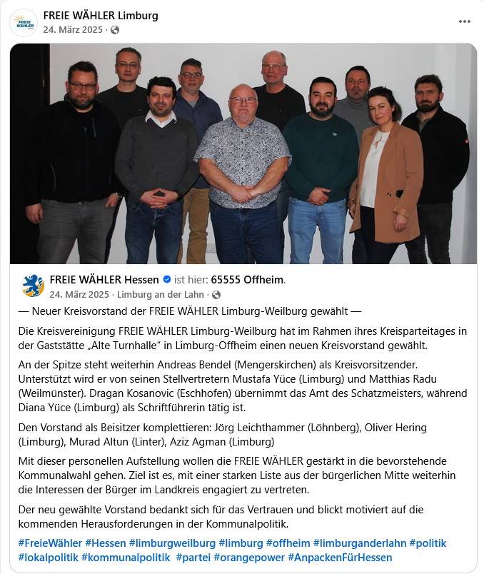 Um Antworten zu erhalten haben wir bei dem Impressumsverantwortlichen der "Freien Wähler Limburg", Mustafa Yüce, der zudem seit März 2025 als stv. Vorsitzender der Freien Wähler im Landkreis fungiert, nachgefragt. Mustafa Yüce ist zudem der Ehemann der Frontfrau der neuen Liste, Diana Yüce. Wer, wenn nicht Mustafa Yüce, könnte uns umfassend Auskunft erteilen?