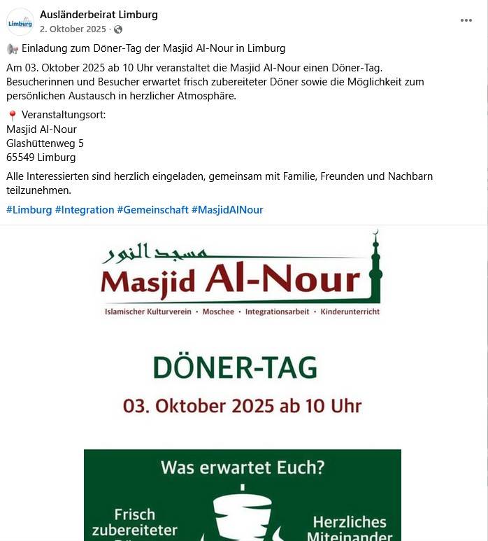 Die Veranstaltung in einer Moschee am 19.12.2025 war nämlich kein Einzelfall. So lud der Ausländerbeirat am 3. Oktober 2025 - also ausgerechnet am "Tag der Deutschen Einheit" - zu einem "Döner-Tag" in die Masjid Al-Nour Moschee in Limburg ein. Diese Moschee ist eine von sechs Moscheen in Limburg.