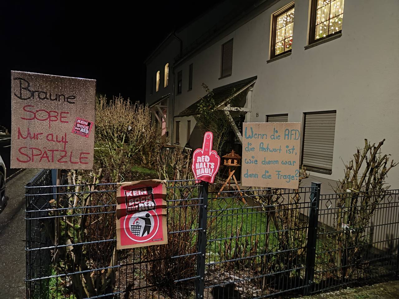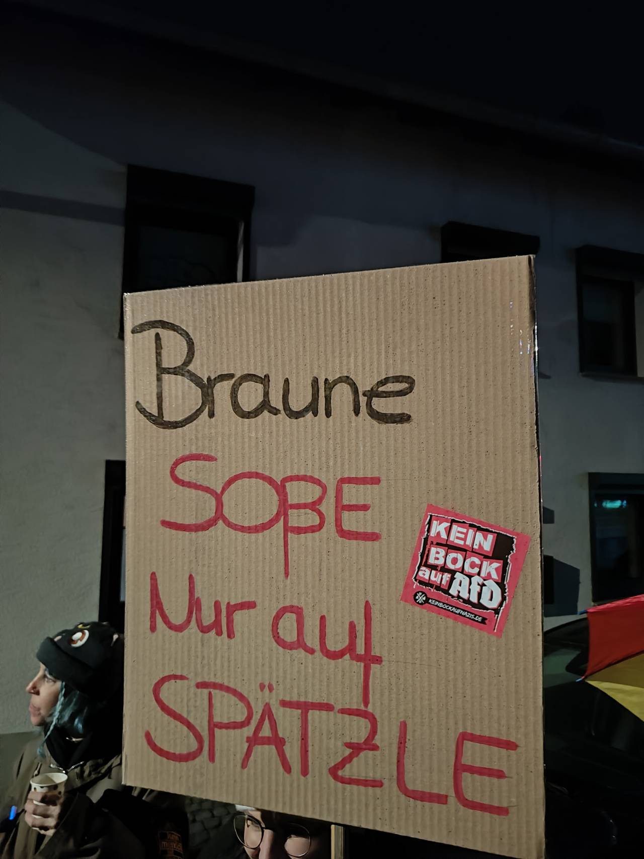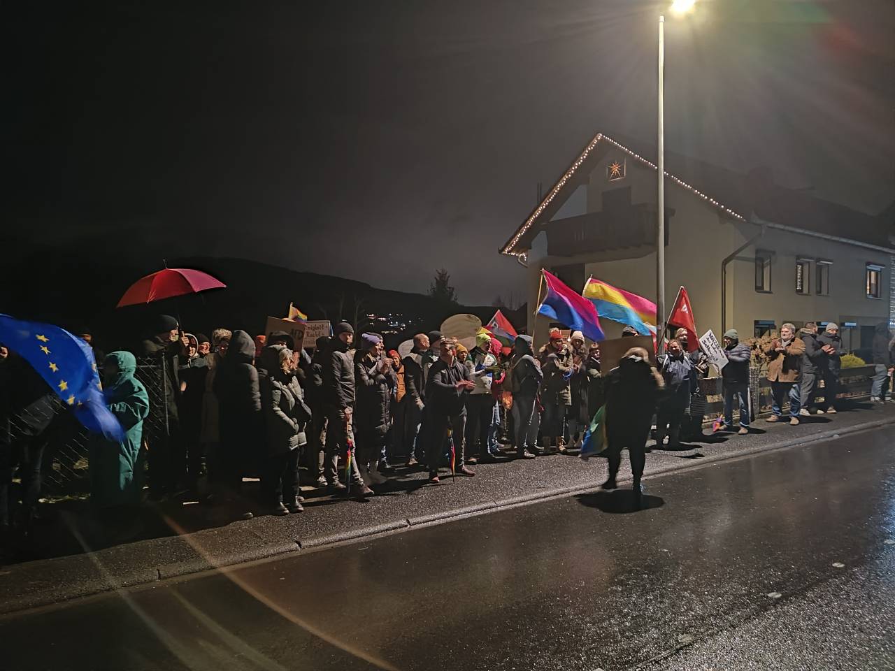 Rund 100 Gegendemonstranten versammelten sich vor dem einzigen Gasthaus des Ortes. Laut wurde es kaum, was weniger an Zurückhaltung als an der Technik lag: Das Megafon war schlicht zu leise. Gesungen wurde dennoch vom „Faschismus im Land“, verbunden mit dem erklärten Ziel, eine demokratisch zugelassene Partei an einem Bürgerdialog zu hindern. Ein Widerspruch, der den Abend wie ein roter Faden begleitete.