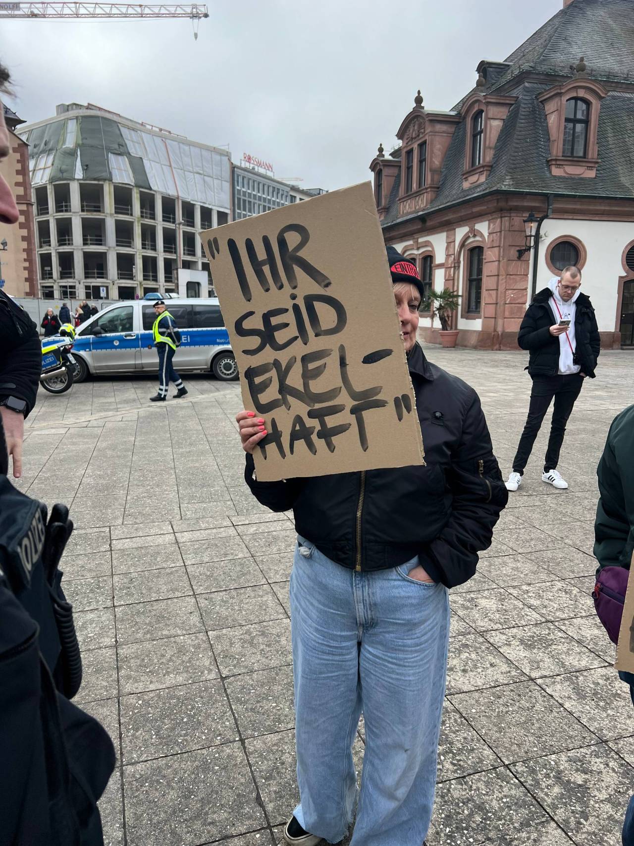 Während Teilnehmerinnen friedlich auf die Straße gingen, um auf ihre Erfahrungen aufmerksam zu machen, kam es laut Espey bereits früh zu massiven Störungen. Drei Frauen stellten sich in unmittelbarer Nähe der Versammlung auf – ohne Anmeldung – und hielten Plakate mit der Aufschrift „IHR SEID EKELHAFT“ hoch. Erst nach einem ausdrücklichen Hinweis an die Polizei griffen die Beamten ein und führten ein „freundliches Aufklärungsgespräch“ über das Demonstrationsrecht.