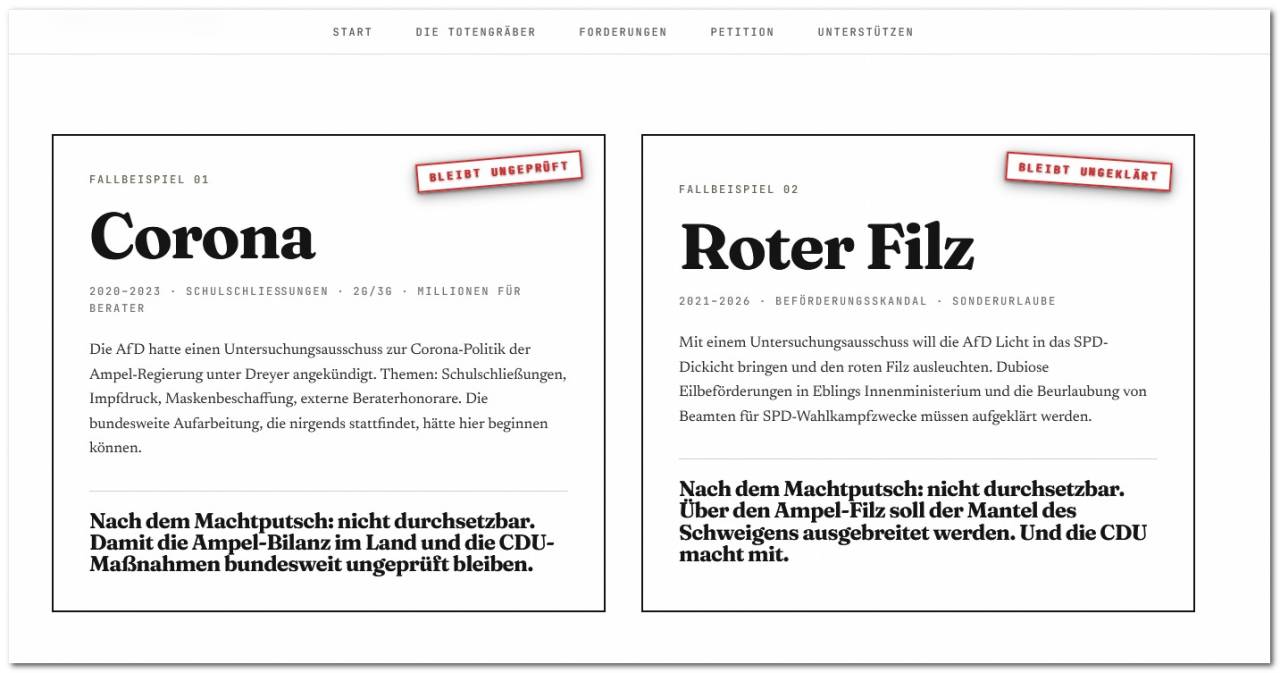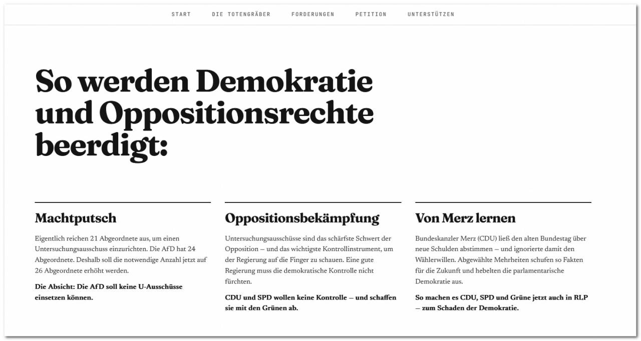 Die Bildsprache von dietotengraeber.de ist hart. Sie arbeitet mit moralischer Zuspitzung und politischer Empörung. Doch gerade weil die geplante Änderung in Rheinland-Pfalz so offenkundig mit der neuen Sitzverteilung zusammenhängt, verfängt diese Zuspitzung. Die Kampagne richtet sich nicht gegen Demokratie, sondern gegen ein Ansinnen, das im Namen des Demokratieschutzes demokratische Kontrollrechte schwächen kann.