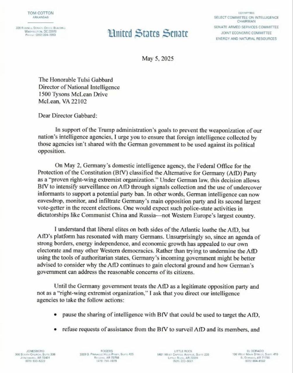 Washington - In einem bemerkenswerten Brief an die US-Geheimdienstchefin Tulsy Gabbard kritisiert der US-Senat die Einschätzung des Bundesamtes für Verfassungsschutzes (BfV) in Bezug auf die AfD und weist die Direktorin der CIA an, die nachrichtendienstliche Zusammenarbeit mit dem BfV in Bezug auf ein mögliches Ziel "AfD" einzustellen. Hier ist die vollständige und wörtliche Übersetzung des Briefes ins Deutsche.