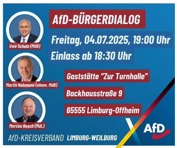 Am 04.07.2025 führte der Kreisverband Limburg-Weilburg der Partei "Alternative für Deutschland" (AfD) einen Bürgerdialog durch. Die Veranstaltung fand in einer Gaststätte in Limburg-Offheim statt. Begleitet wurde die Veranstaltung von einem Gegenprotest der "linken Zivilgesellschaft". In einem ersten Bericht stellt die Lokalpresse diesen Gegenprotest, bei dem ca. 150 Personen - darunter auch Kinder - versammelt waren, als "äußerst friedlich" dar.