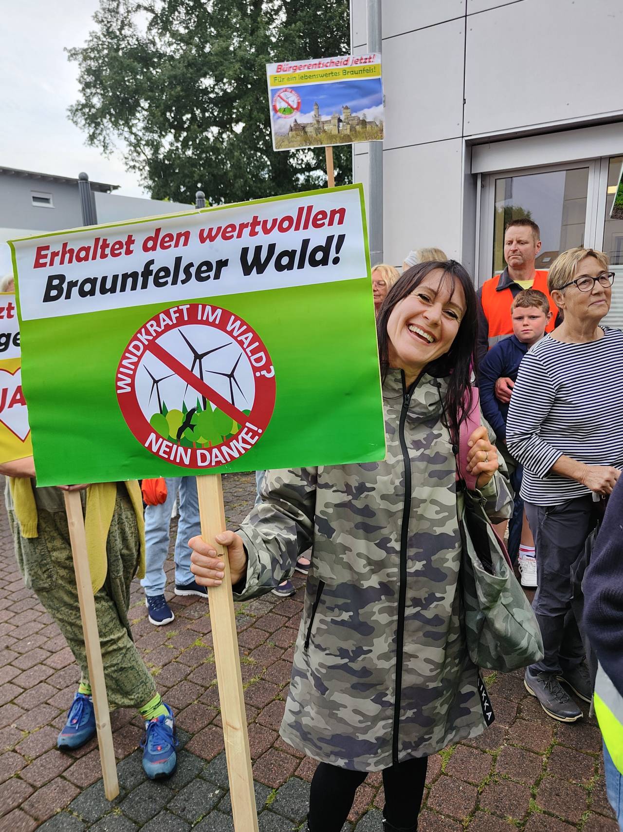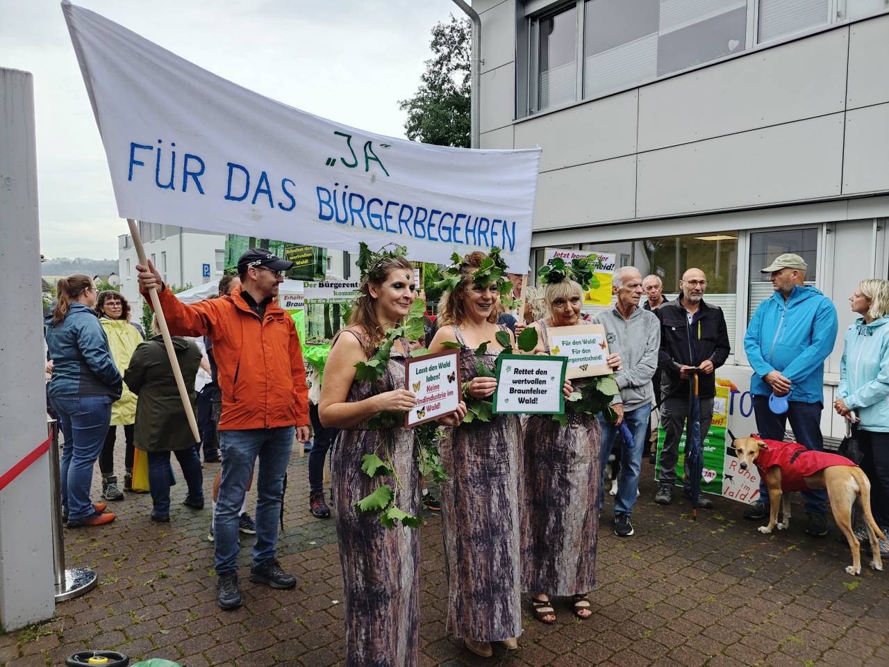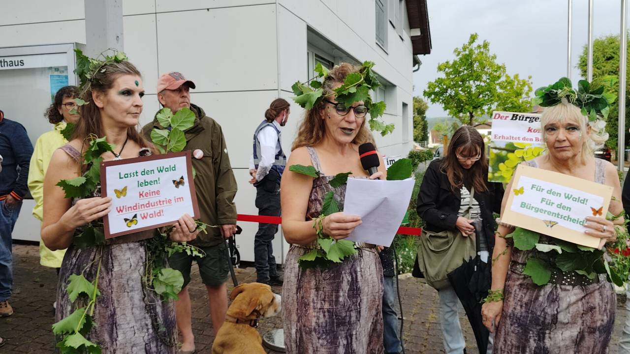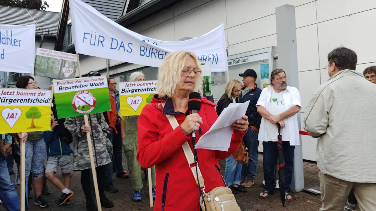Braunfels - Am 28.08.2025 tagte die Braunfelser Stadtverordnetenversammlung. Auf der Tagesordnung: der Plan des Magistrats, im Wald bei Tiefenbach fünf Windräder zu errichten und das Begehren von mehr als 2.000 Braunfelsern Bürgern, in dieser Frage über einen Bürgerentscheid mitbestimmen zu dürfen. Im Vorfeld der Sitzung fand vor dem Braunfelser Rathaus eine Demonstration verschiedener Bürgerinitiativen statt, die sich unter dem Motto "Rettet Tiefenbachs Wälder" zusammengeschlossen haben und ein Bürgerbegehren initiiert haben.