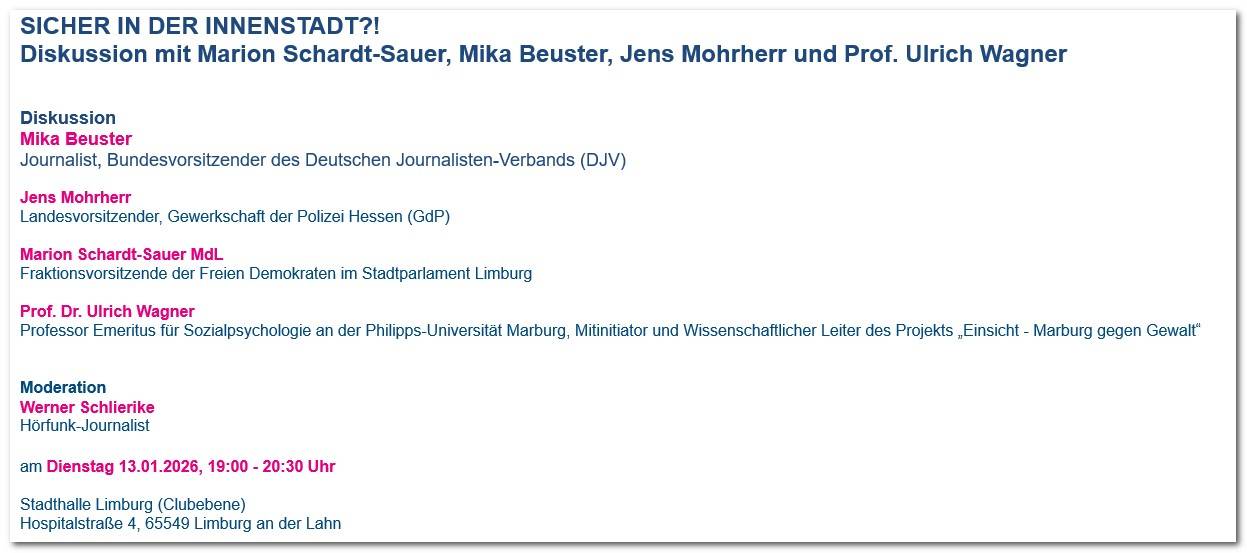 Am Dienstagabend, dem 13. Januar 2026, diskutierten auf Einladung der Friedrich-Naumann-Stiftung in den Clubräumen der Limburger Stadthalle zentrale Akteure aus Politik, Polizei, Wissenschaft und Medien über die Sicherheitslage in deutschen Innenstädten – mit besonderem Blick auf Limburg. Der Titel der Veranstaltung, „Sicher in der Innenstadt?!“, war dabei bewusst als Frage formuliert. Eine Frage, die im Laufe des Abends viele Antworten erhielt – aber auch erstaunlich viele offene Stellen offenbarte.