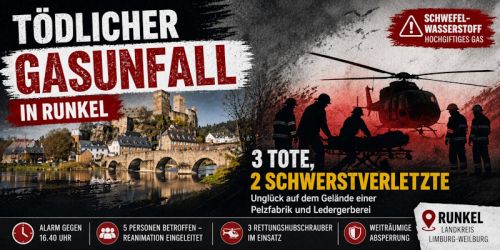 Runkel – Ein tragischer Unfall mit einem hochgiftigen Gas hat am Mittwochnachmittag die Gemeinde Runkel im Landkreis Limburg-Weilburg erschüttert. Auf dem Gelände einer Pelzfabrik und Ledergerberei kamen mindestens drei Menschen ums Leben, zwei weitere wurden schwerstverletzt. Das Portal Mittelhessen berichtete zuerst.