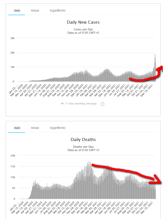 Schnell wurden Reisebeschränkungen erlassen, um die weitere Verbreitung "zu bremsen". Doch Omikron fand und findet seinen Weg. Die Fallzahlen explodieren - weltweit. Zuerst in Südafrika, dann in UK, Dänemark, nun in den USA. Gleichzeitig vermeldete Südafrika jedoch sehr milde Verläufe und erkannte die Chance einer vergleichsweise "preiswerten" Durchseuchung - und hob die meisten Maßnahmen einfach auf. Auch in UK und Dänemark lässt man die neue Virusvariante bislang weitgehend ohne Einschränkungen gewähren. Denn Omikron erweist sich bislang eher als Schnupfen-, denn als Killer-Virus. Das nachfolgende Chart von www.worldometer.com, welches die globalen Fall- und Sterbezahlen von Corona visualisiert, spricht bislang eine klare Sprache: